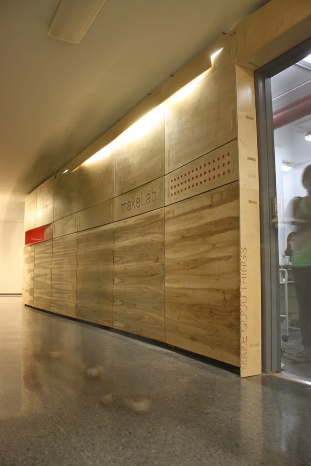 The makeLab storefront is designed as a skin for an existing block wall and window. Coordinating with existing conditions required careful assembly planning and a fluid motion between design and making. The entire wall is built using friction fit joinery to connect CNC cut baltic birch panels.| Kroodsma | Hartsuff |